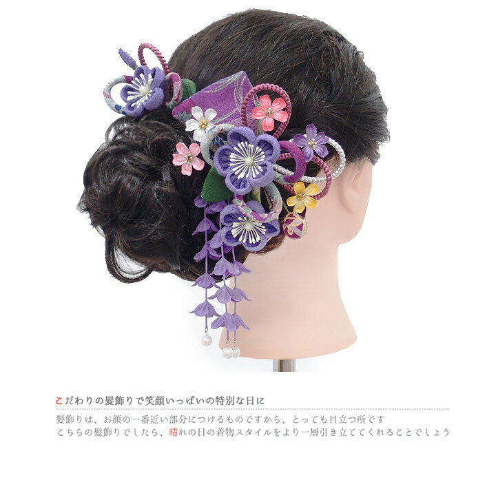 ちりめんのつまみ飾りと、揺れる藤の花房が、女性らしく華やかな装いを演出するお品です。